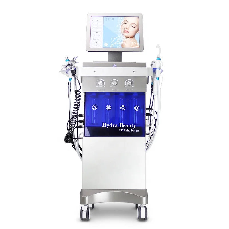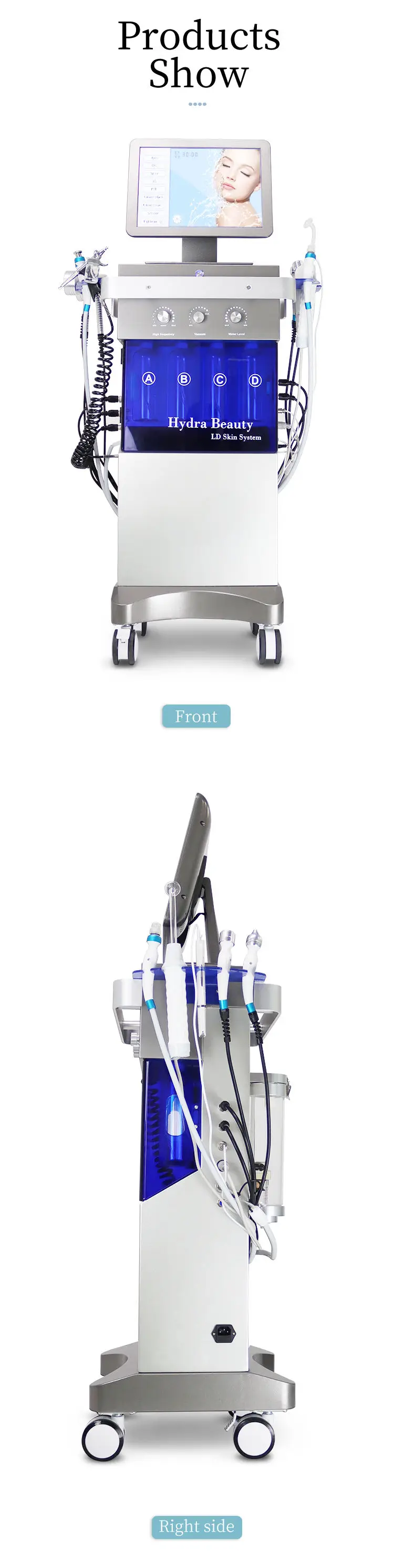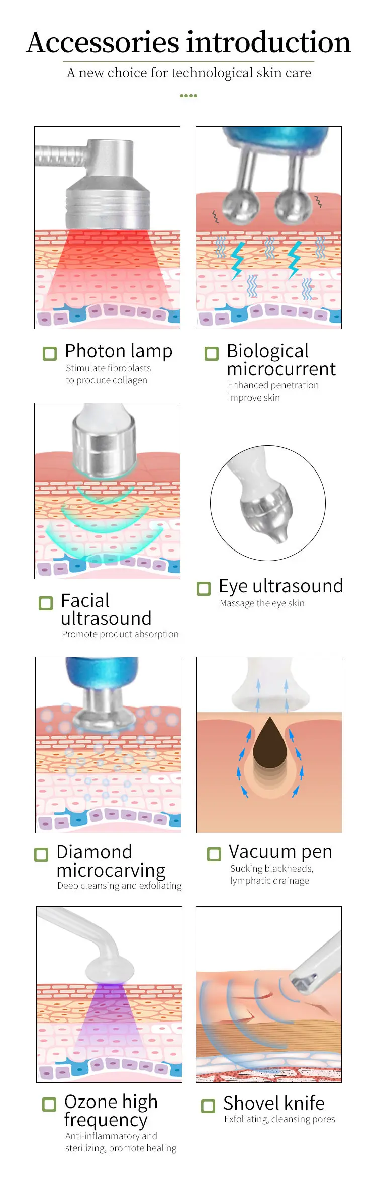 Handles | Hydro dermabrasion with 8 tips Bio microcurrent 1 piece Vacuum pen 3 different sizes Photon light with 2 handles Spray mist gun 1 piece High frequency 1 piece Ultrasonic 2 piece Dermabransion 1 pcs Skin scrubber 1 pcs |