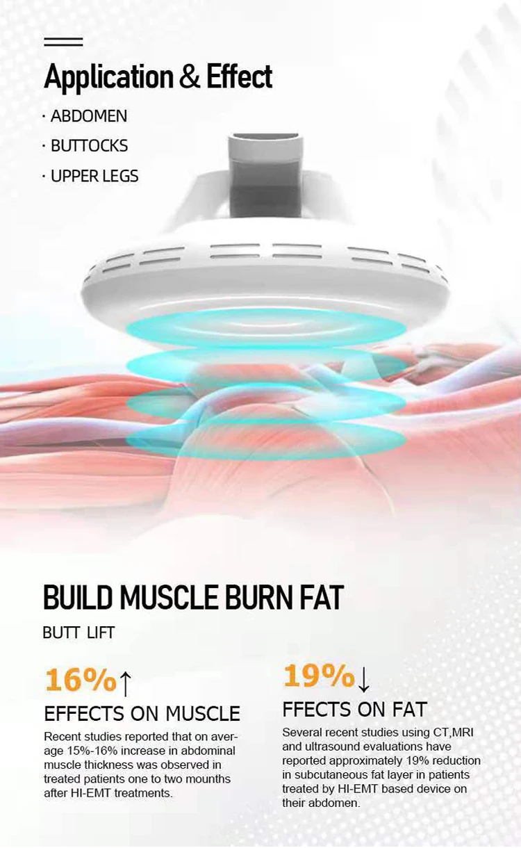 Clinical studies report an average fat reduction of 19% associated with an increase in muscle mass of 16% during a treatment consisting of 4 to 6 sessions, spaced every 2 to 3 days. Treatments areas include abdomen, buttocks, arms and thighs.