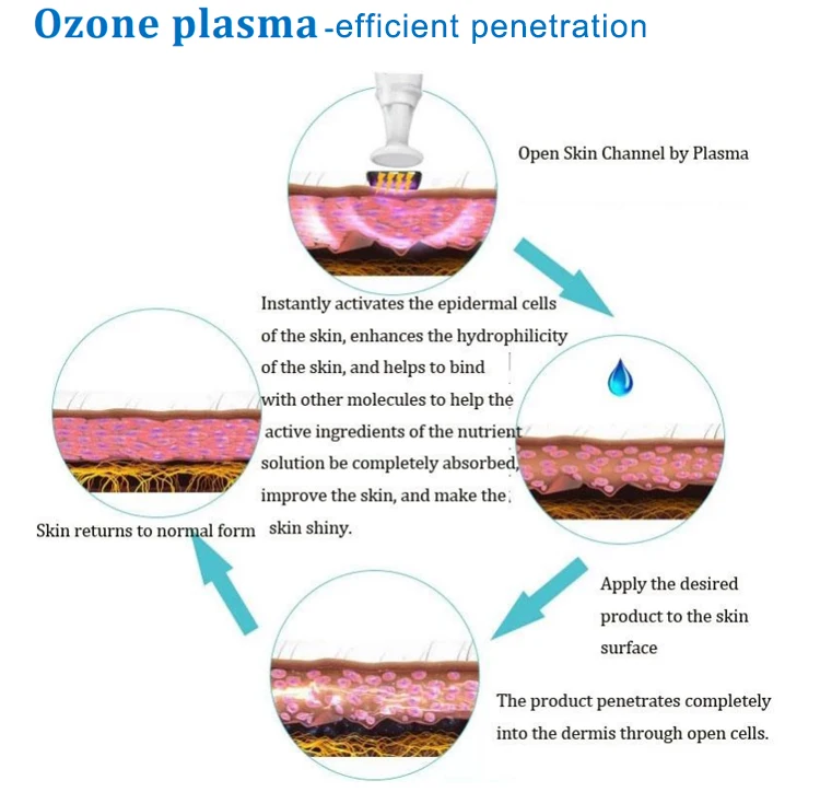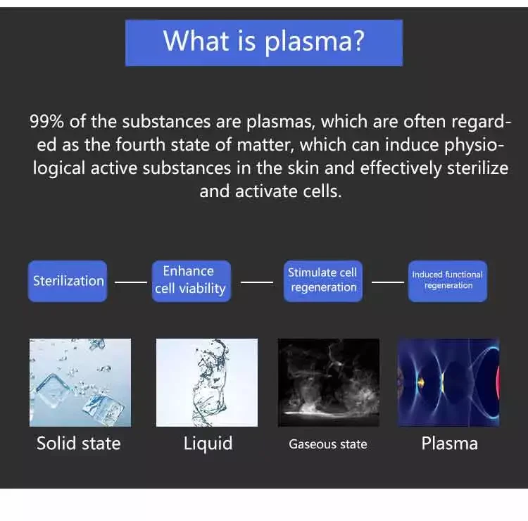 Plasma is composed of ions and electrons and is an ionized gas with electrical energy. Space plasma releases electrical energy, using plasma conduction technology to open the mucous membrane principle of skin cells, inducing and changing the ion's position, allowing them to freely pass through the cell membrane. When the cell membrane voltage increases, it helps the cells to produce tension, so that the cation dislocations on the medial and lateral sides of the cell membrane are corrected, the membrane potential returns to an equilibrium state, the cells return to normal operation, the skin regenerates, and the skin tissue resistance is enhanced. Effectively improve the skin surface, in the treatment of acne, scars while not destroying cells, with skin rejuvenation, sterilization, antibacterial, anti-inflammatory, whitening, improve skin sagging and other effects.