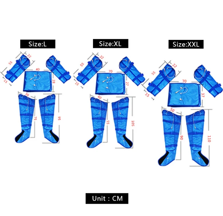 This machine takes body slimming, relaxation, and detoxification functions in one. It has clothes, every cloth with air bags, strainers. Air bags are symmetrical. There is each around the waist and belly. Also symmetrical from top to bottom on the legs. Can freely apply on every part which is needed obesity removal.